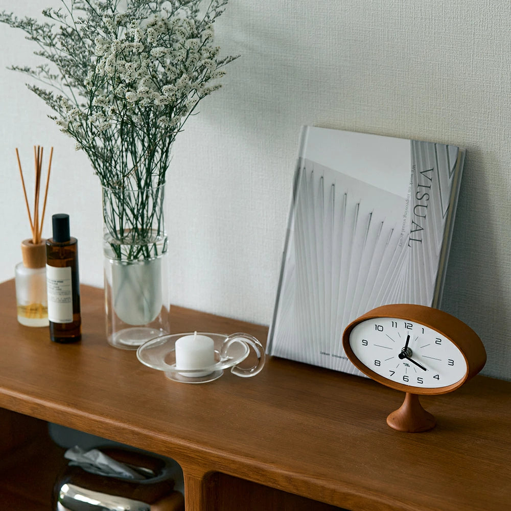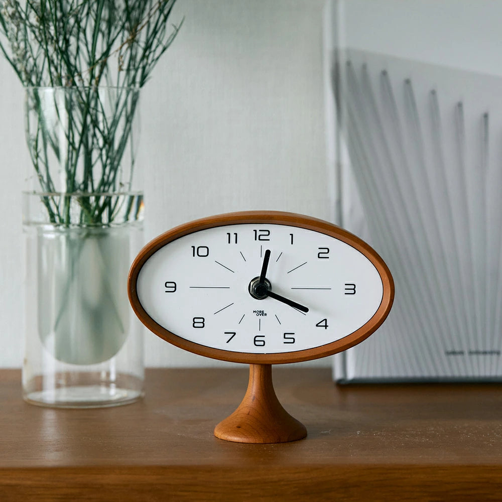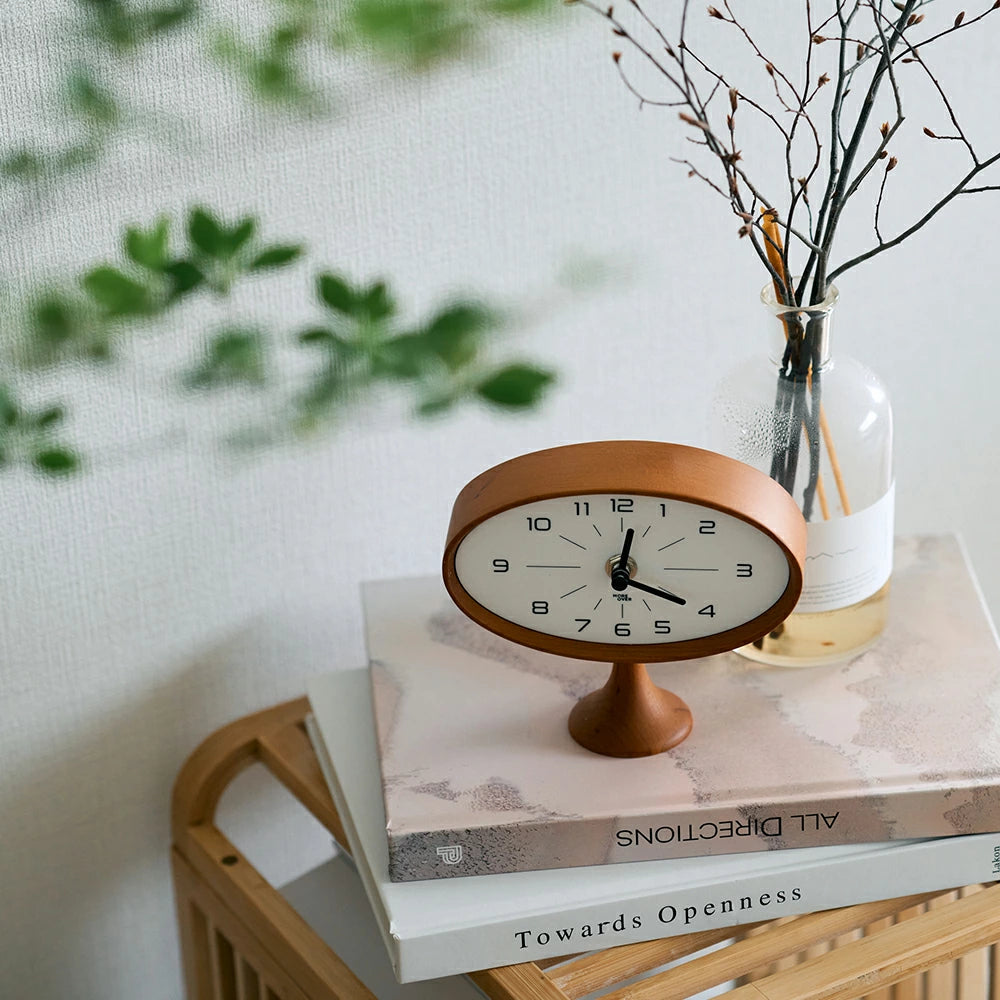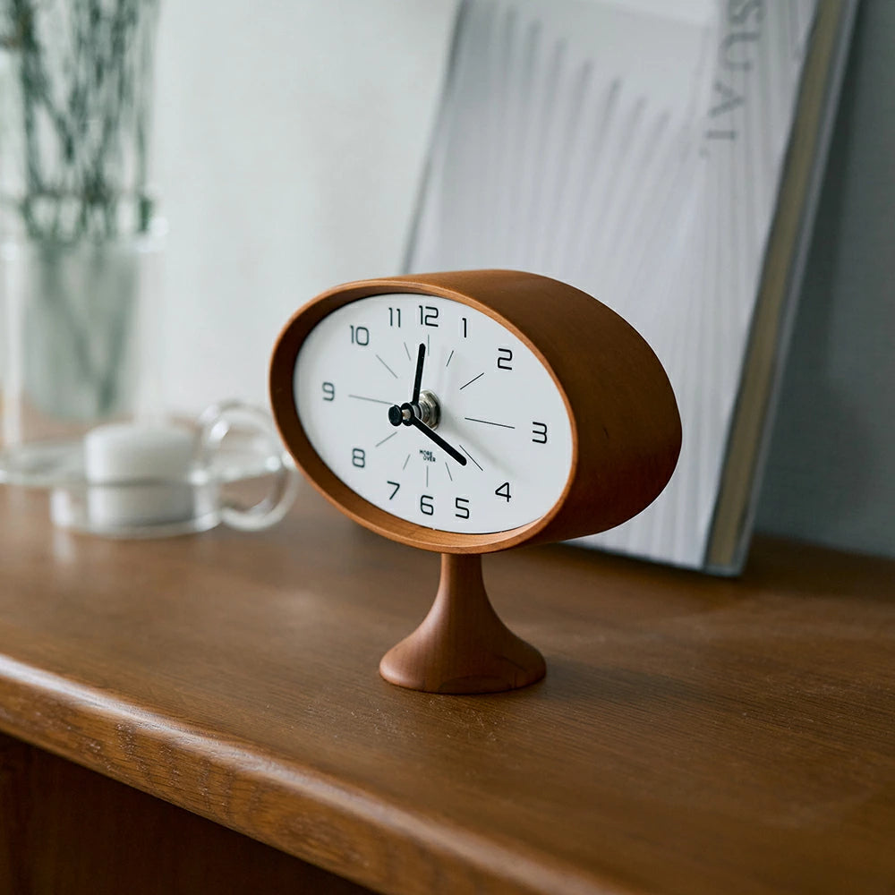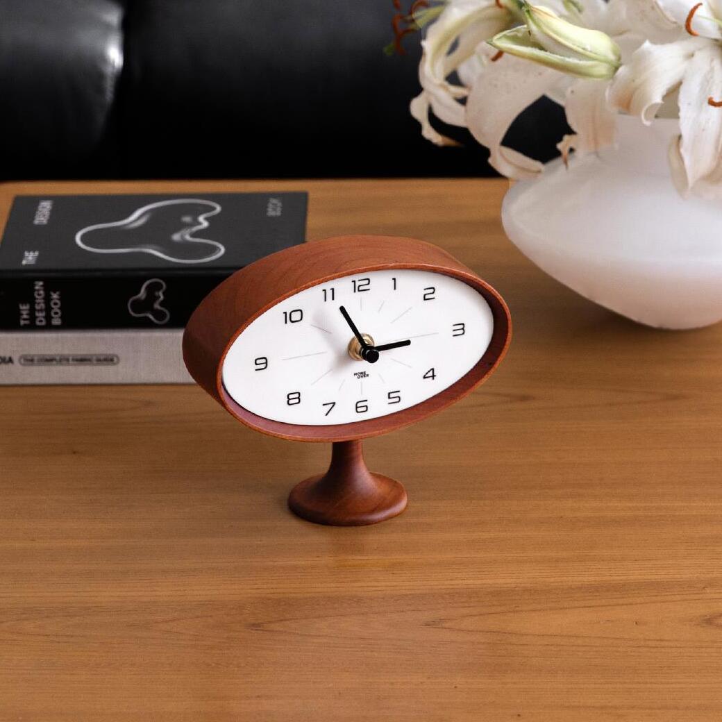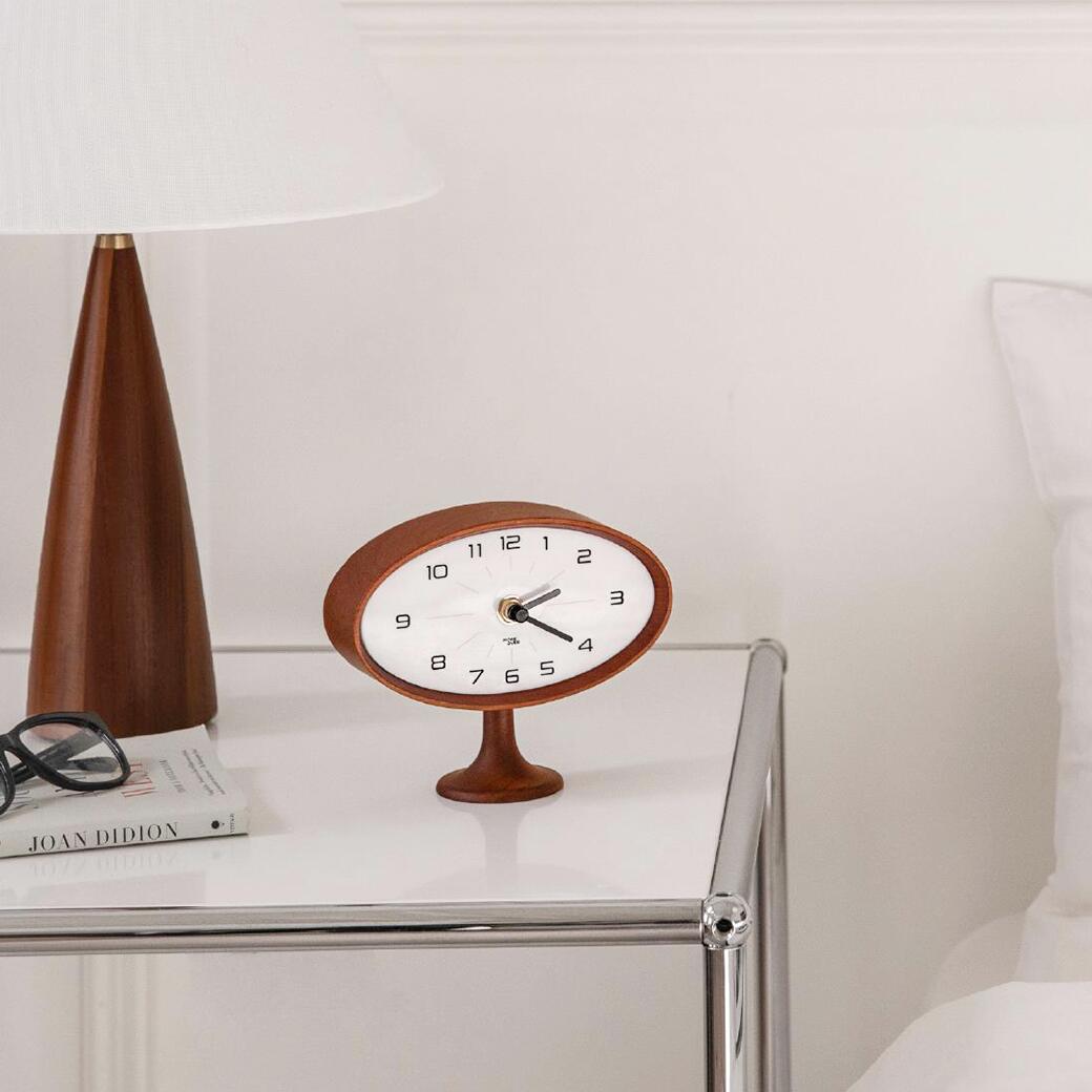 レトロな雰囲気が魅力の天然木のテーブルクロックです。70~80年代に流行した流線形を生かした近未来的なフォルムが特徴で、時計としての機能に加え、棚やテーブル、ベッドサイドに置くだけでおしゃれなアクセントになります。静音仕様のため、寝室でも音を気にせず安心してお使いいただける実用性も兼ね備えたアイテムです。