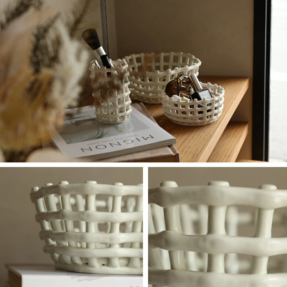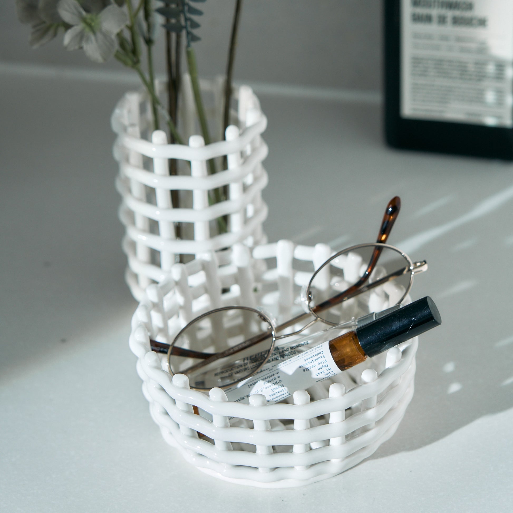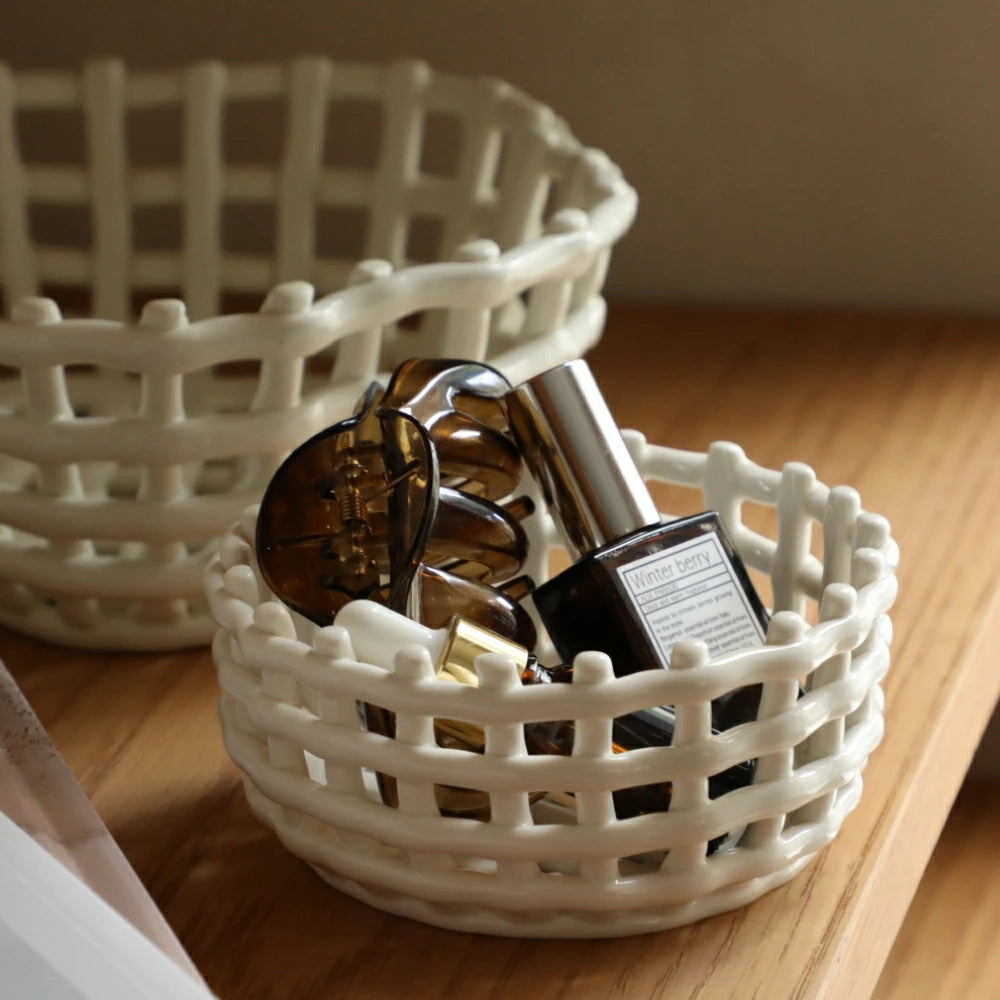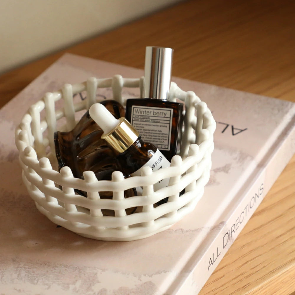 暮らしに寄り添うハンドメイドバスケット 手作りの風合いが魅力のセラミックバスケット。 やさしい質感で空間に自然な調和をもたらします。 アクセサリーや鍵などの小物置きとして、ベッドルームや玄関先などシーンを問わずご使用いただけます。