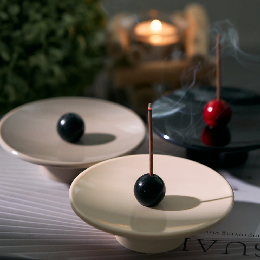 空間を整えるシンプルモダンなお香立て 落ち着いたデザインが魅力の、お香立てです。 プレート部分は丈夫で扱いやすいメラミン樹脂製、中央の木球がデザインのアクセントになっています。