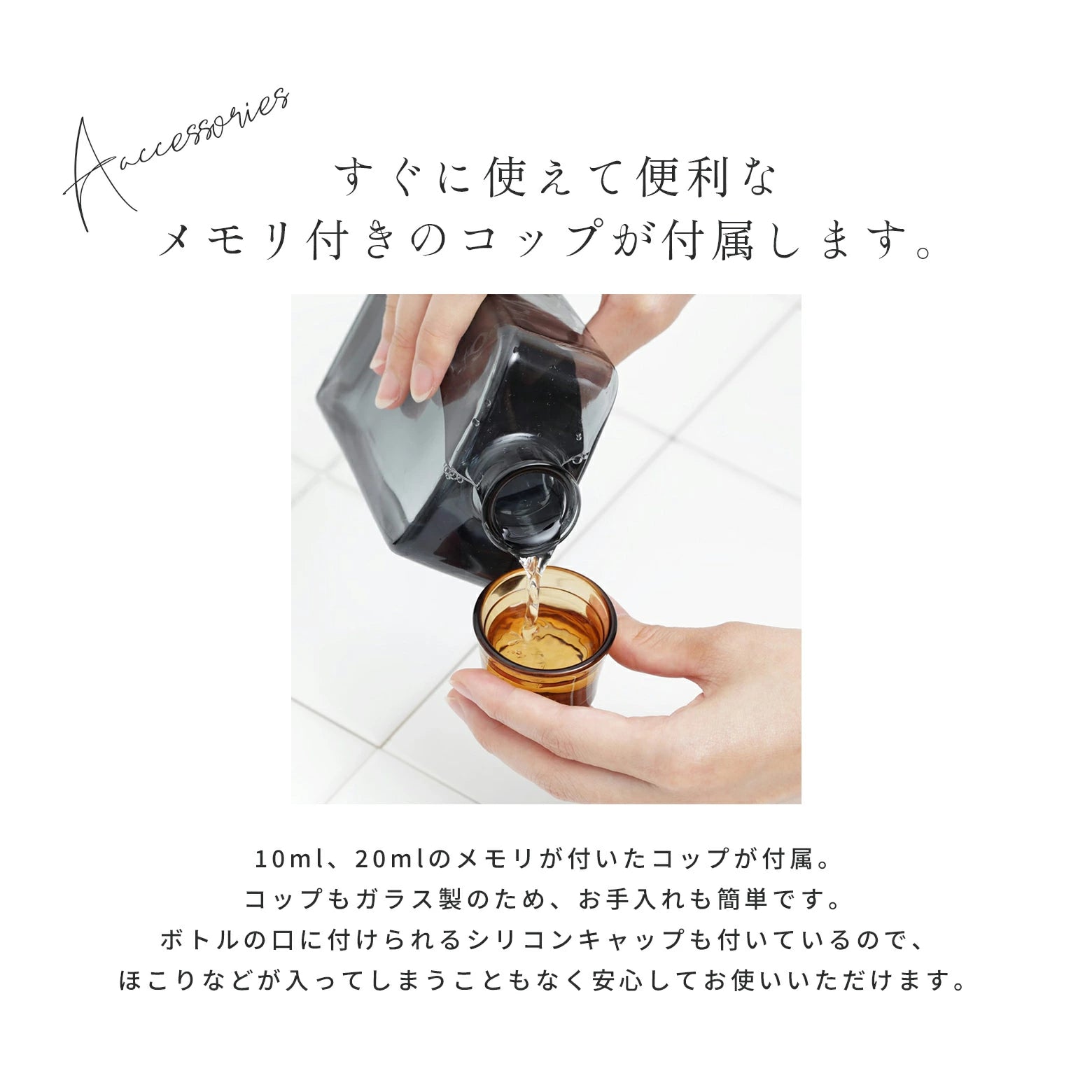10ml、20mlのメモリが付いたコップが付属。コップもガラス製のため、お手入れも簡単です。