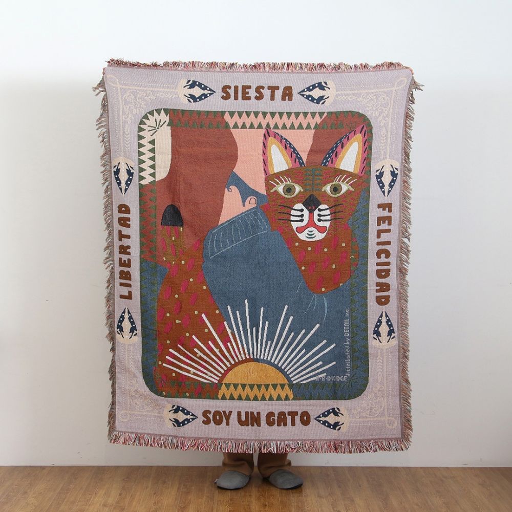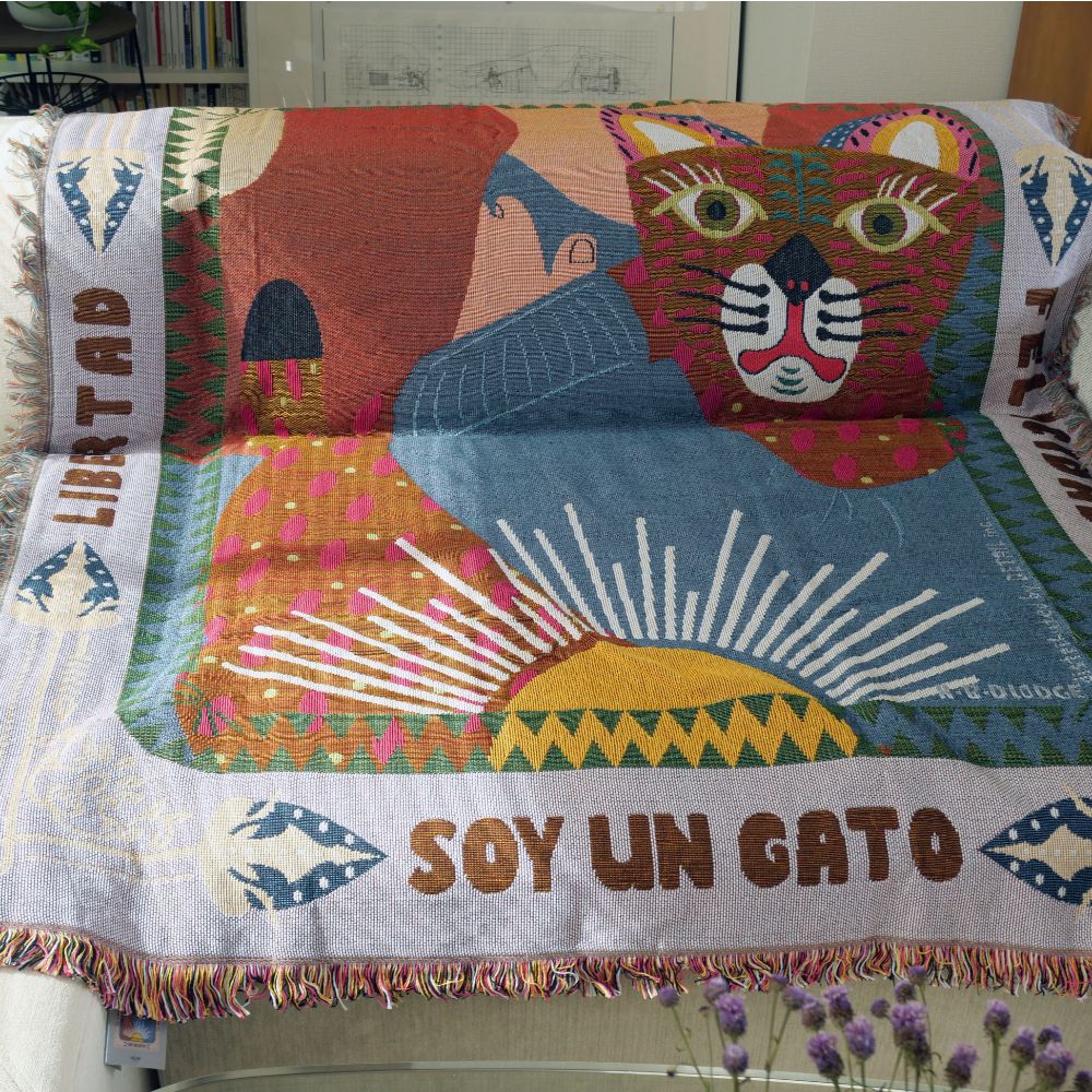 飼い主に愛をもって大切に抱かれた姿がどこか誇らしげで風格漂う猫。周囲にはスペイン語の”SOY UN GATO(吾輩は猫である)”や、自由・幸せ・昼寝など、猫の自由を謳歌する姿を連想するワードを組み合わせたデザインです。